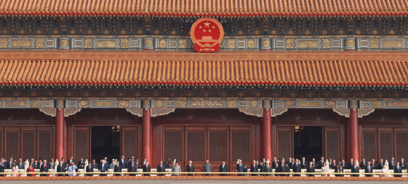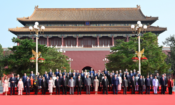 大会开始前,习近平和夫人彭丽媛在端门外广场迎接出席大会的外方代表团团长及其配偶,并同他们合影留念。